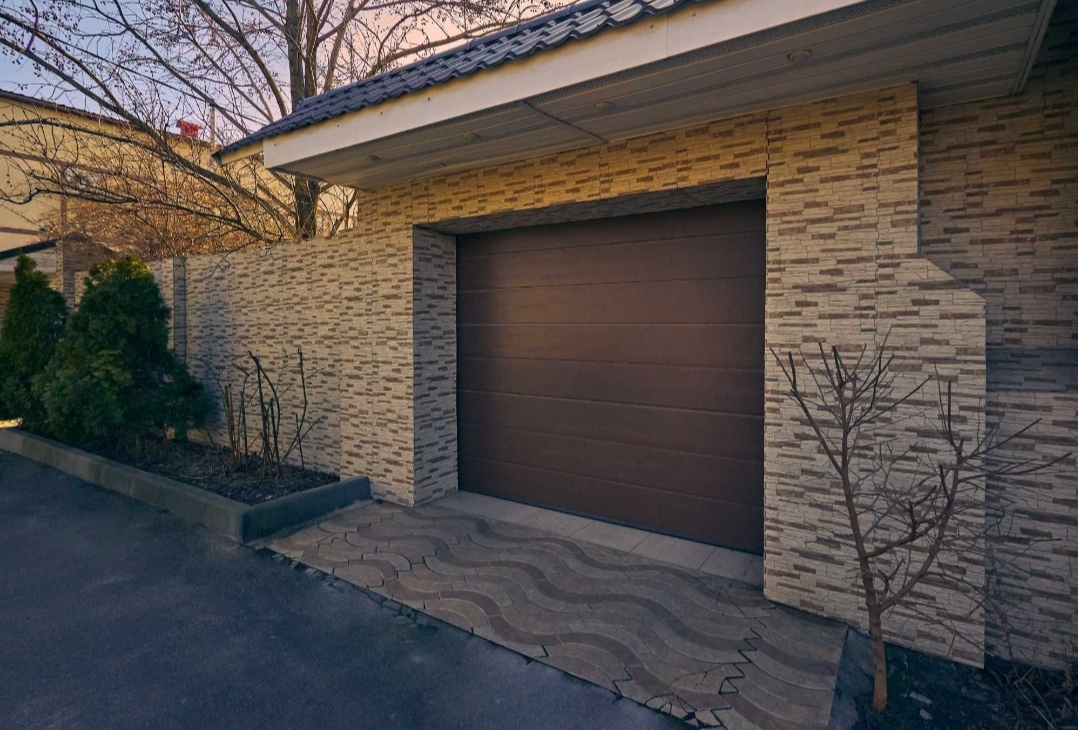 Просторий гараж для мікроавтобуса з плиткою на підлозі та ролетними автоматичними воротами.