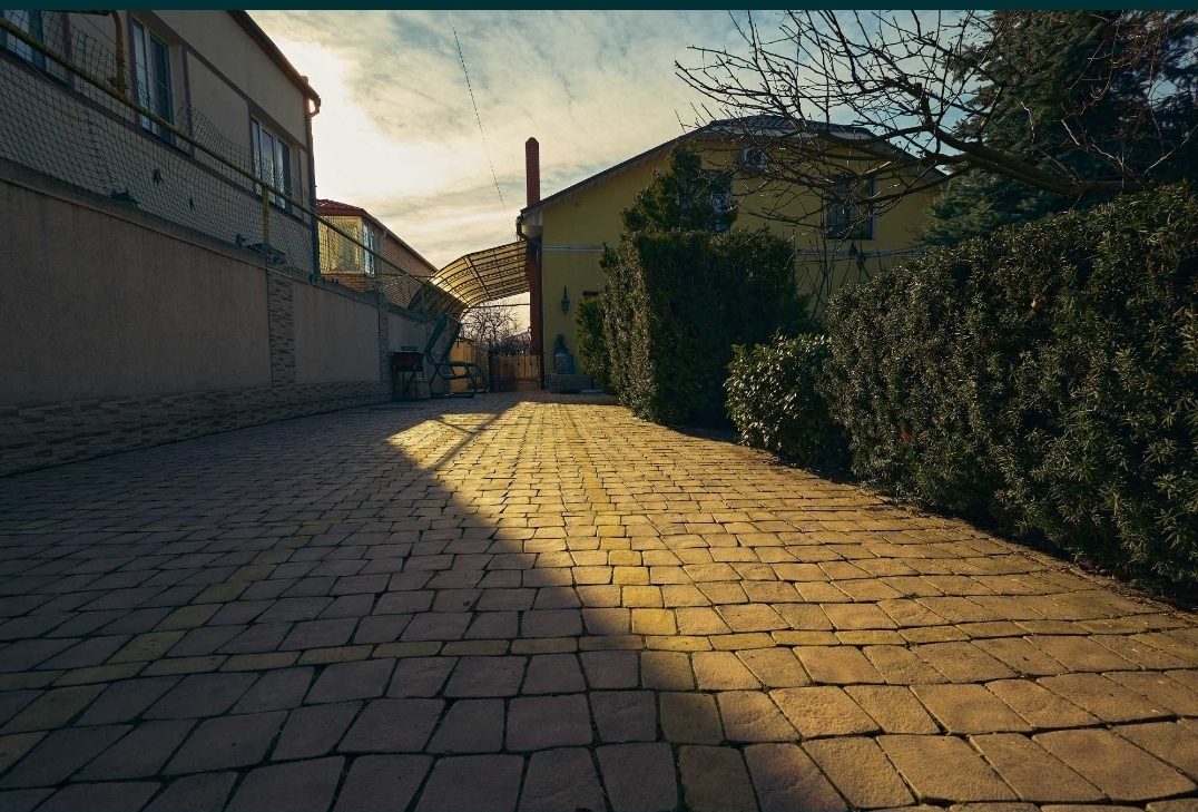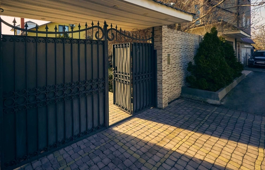 Ковані металеві вхідні ворота та просторий паркінг на три автомобілі. Паркінг та двори біля будинку викладені з орнаментом плиткою “Старе місто”