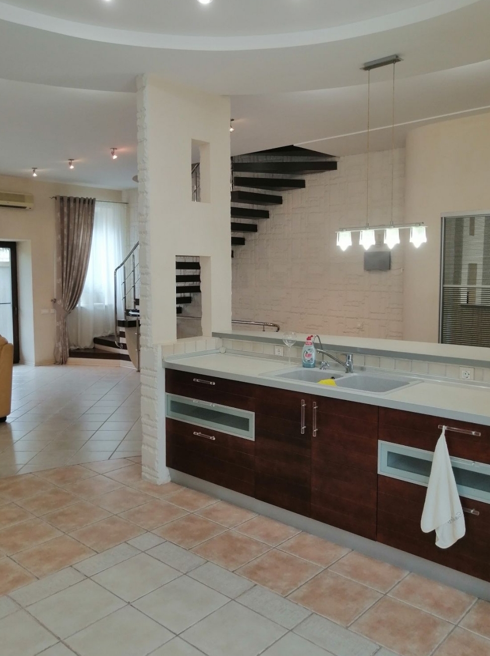 На першому поверсі кухня та зала поєднані. У передпокої є вбиральня.